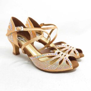 Questo Modello di scarpe per ballo con brillantini è realizzato interamente in Italia con pregiato RASO Tan-Bronzo.